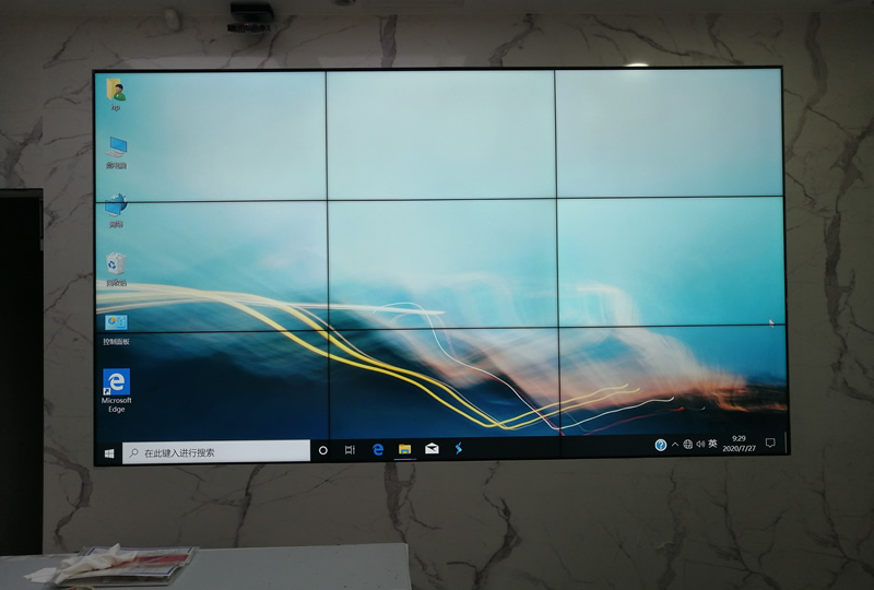 這套大屏采用3x3拼縫、46寸1.7mm液晶拼接屏,采用前維護(hù)內(nèi)嵌式安裝,大屏幕與墻面連成一體,更顯美觀、大氣,主要用來會議信息顯示。