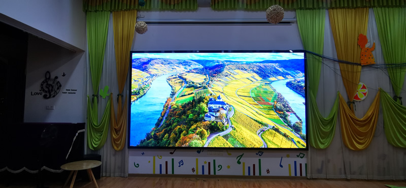 本案例中,維康國(guó)際為東莞市某幼兒園提供一套高清LED大屏,采用P1.86小間距LED系列,顯示面積約10平方米,大屏幕顯示清晰,一體化效果好。