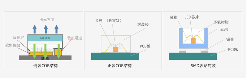相比SMD封裝工藝而言,COB封裝不再是先封裝成燈珠再焊接,而是直接把LED芯片封裝在PCB基板上,所以它也叫板上芯片封裝,它簡化了整個封裝的流程,不再需要支架與回流焊環(huán)節(jié),從而使得整個芯片與基板呈一個平面,這也解決了后期的掉燈現(xiàn)象出現(xiàn)。