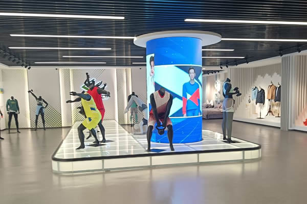 LED 顯示屏:以高清顯示、無縫拼接為核心亮點,規(guī)格覆蓋點間距 P0.7-P16,商場服裝店常用點間距較小的,如 P1.53(近距精細展示)、P1.86(墻面常規(guī)拼接)、P2(大面積展示墻)三類。點間距越小,分辨率與畫面細膩度越高,例如 P1.53 屏的清晰度優(yōu)于 P2 屏,但對應成本也更高 —— 小間距 LED 系列每平方米價格普遍高于普通大屏。LED顯示屏在拼接后仍保持一體化顯示,搭配廣視角與高對比度,即便在商場強光環(huán)境下,畫面依然鮮艷通透,適合打造店鋪入口巨幅展示墻、中島環(huán)形屏,用于播放品牌走秀視頻、新品全景展示等內容,尤其適配高端服飾品牌的沉浸式視覺需求。