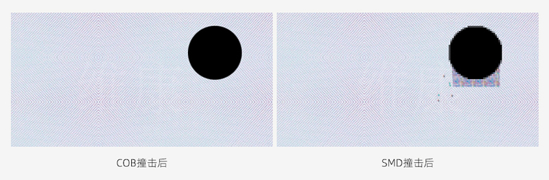 COB小間距顯示屏由于是直接把芯片封裝在了PCB基板上,在表面使用的環(huán)氧樹脂封裝,所以表面更加耐磨防撞,防塵防水,如下圖所示,在受到撞擊后,COB小間距顯示屏不會掉燈,而傳統(tǒng)的SMD表貼式LED屏則非常容易掉燈。