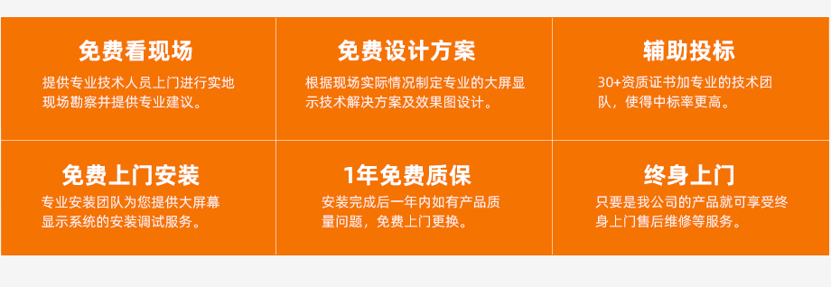 公司提供全面的技術方案設計服務,同時提供專業(yè)技術上門安裝與調(diào)試,特別是一些大型的弧形屏顯示領域,對于LED軟模組的拼接有很高的技術要求,另外公司還提供長期質(zhì)保以及上門售后服務。